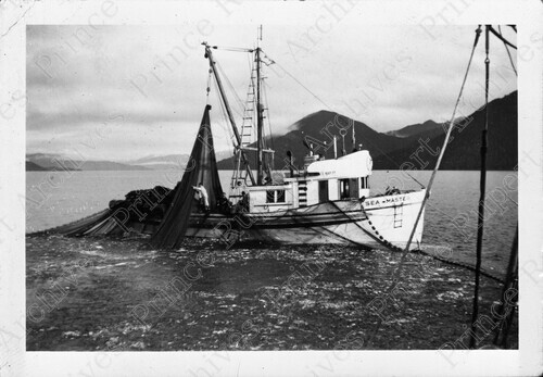 Scope & Content: Item consists of the herring boat "Sea Master" with is catch in nets (at the Prince Rupert harbour?). Handwritten annotation on recto of copy 2 reads: "Sea Master. 1950. Herring Catch." Stamped annotation on verso of copy 2 reads: "Photo by Jack Wrathall Prince Rupert, B. C. 1950 Herring Boats."