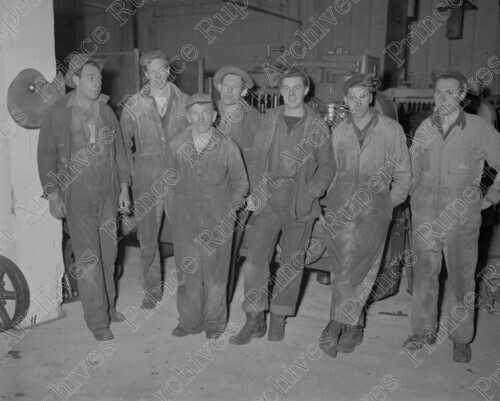 Scope & Content: Item consists of seven members of the machine crew at Oceanside Cannery. The men pictured are Doug Browne, Ralph Holte, Bill Hale, W.F. Floyd, Harry McGee, Harold Britten and Bill Griffith. Handwritten annotation on recto of copy 2 reads: "Machine Crew. Oceanside Cannery. Ocean Dock - 1951." Stamped annotation on verso of copy 2 reads: "Photo by Jack Wrathall Prince Rupert, B. C. Sunnyside Can."