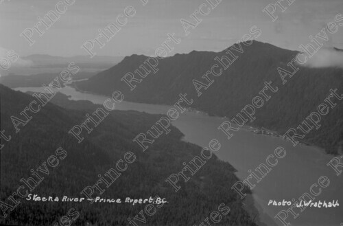 Scope & Content: Item consists of an aerial view of the Skeena River canneries Inverness Cannery, North Pacific Cannery, Sunnyside Cannery and Cassiar Cannery. Handwritten annotation on recto of copies 1 and 2 reads: "Skeena River - Prince Rupert, B.C. Photo J. Wrathall." Handwritten annotation on recto of copy 3 reads: "Skeena River Slough. Showing Canniers [sic]. 1935." Stamped annotation on verso of copies 2 and 3 reads: "Photo by Jack Wrathall Prince Rupert, B. C." Stamped annotation on verso of copy 4 reads: "Wrathall's Photo Finishing Commercial Photographers Prince Rupert, B. C. Sunnyside, North Pacific, Inverness."
