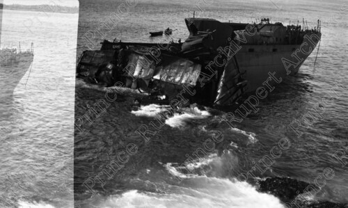 Scope & Content: Item depicts a freighter broken in half. A person can be seen rowing a rowboat on the left. Handwritten annotation on recto of copy 3 reads: "Freighter Hit the Rocks. Broke in Half." Stamped annotation on verso of copy 3 reads: "Photo by Jack Wrathall Prince Rupert, B. C."