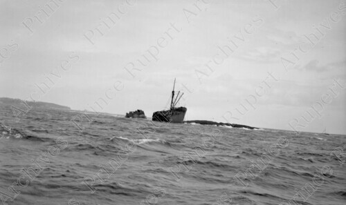 Scope & Content: Item consists of a broken up freighter in a harbour (the Prince Rupert harbour?). Handwritten annotation on recto of copy 2 reads: "Freighter on the Rocks. Broke in Half." Stamped annotation on verso of copy 2 reads: "Photo by Jack Wrathall Prince Rupert, B. C."