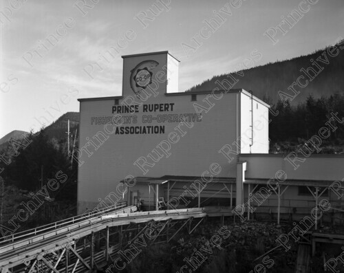 Scope & Content: Item consists of the exterior of the ice house at the Prince Rupert Fishermen's Co-op. Handwritten annotation on recto of copy 2 reads: "Ice House. 1950. At Fairview." Stamped annotation on verso of copy 2 reads: "Photo by Jack Wrathall Prince Rupert, B. C."