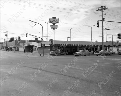 Scope & Content: Item consists of the exterior of a Credit Union and Co-op Hardware on the 100 Block of 3rd Avenue West. Cars can be seen parked on the street view from McBride looking east, and the Totem Theatre can be seen in the background. Handwritten annotation on recto of copy 2 reads: "P.R. Fishermen's Co-op Centre. 100 - Blk. 3rd. Ave. W. 1967." Stamped annotation on verso of copy 2 reads: "Photo by Jack Wrathall Prince Rupert, B. C."