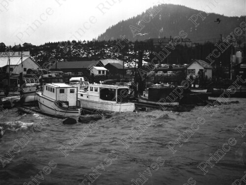 Scope & Content: Item consists of a view of boats at the Prince Rupert Yacht Club at Cow Bay during a storm. Handwritten annotation on recto of copy 2 reads: "Yacht Club. During Storm. Pr. Rupert. 1948." Stamped annotation on verso of copies 2 and 3 reads: "Photo by Jack Wrathall Prince Rupert, B. C."