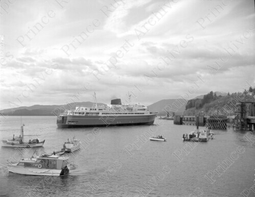 Scope & Content: Item consists of the Alaska Ferry "Malaspina" pulling into a ferry slip. Small boats can be seen nearby. Handwritten annotation on recto of copy 2 reads: "Alaska Ferry. Malaspina Arriving Prince Rupert. Apr. 1963." Stamped annotation on verso of copy 2 reads: "Photo by Jack Wrathall Prince Rupert, B. C."