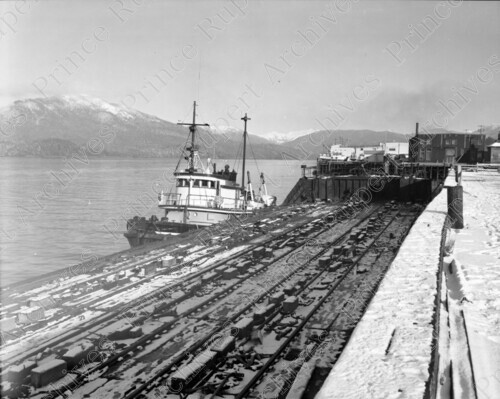 Title: Tugboat and Barge at the End of the Ocean Dock in Prince Rupert, B. C. Including the "Hercules" from Seattle in 1965