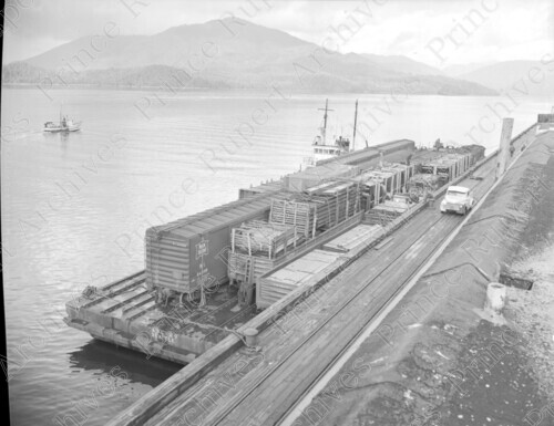 Scope & Content: Item consists of the tugboat "Monarch" and damaged goods on a barge at the Ocean Dock. Another boat can be seen in the harbour on the left. Handwritten annotation on recto of copy 2 reads: "At Ocean Dock Pr. Rupert. 1962. Tug Boat Monarch. Damaged Goods on Barge. Alaska B.C. Transportation." Stamped annotation on verso of copy 2 reads: "Photo by Jack Wrathall Prince Rupert, B. C."