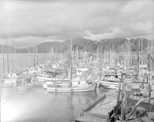 Scope & Content: Item consists of trollers moored at the Prince Rupert Fishermen's Co-op during strike in July 1963. Boats pictured include the "Waterfall," "Dovre B," "Linda Gail," "Sylou," and "Hike." Handwritten annotation on recto of copy 2 reads: "1963 - Troller at Fairview Floats. During Fish Strike."