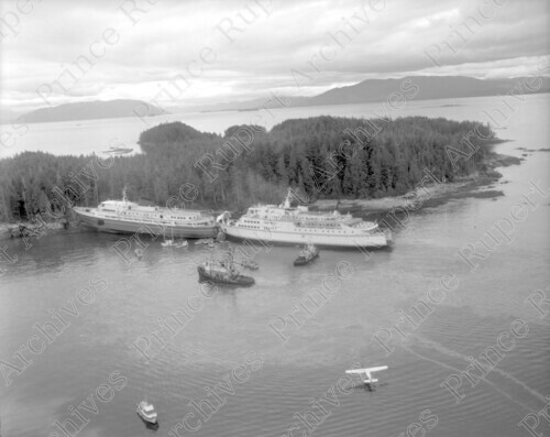 Scope & Content: Item consists of an aerial of the BC Ferry "Queen of Prince Rupert" unloading passengers off the Alaska Ferry "Taku" run aground on the Kinahan Islands. Handwritten annotation on recto of copy 2 reads: "Queen of Prince Rupert Unloading Cars & Passengers. Taku. Alaska Ferry. Ran onto Kinahan Isl. Queen of Prince Rupert. July 29. 1970." Stamped annotation on verso of copy 2 reads: "Photo by Jack Wrathall Prince Rupert, B. C."