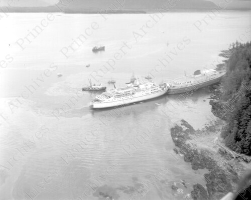 Scope & Content: Item consists of an aerial of the BC ferry "Queen of Prince Rupert" unloading passengers off the Alaska ferry "Taku" which has run aground on the Kinahan Islands. Handwritten annotation on recto of copy 2 reads: "Queen of Prince Rupert. Taking off Passengers. July 29 - 1970. Alaska Ferry - Taku - On Kinahan Isl." Stamped annotation on verso of copies 2 and 3 reads: "Photo by Jack Wrathall Prince Rupert, B. C."