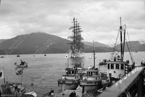Scope & Content: Item depicts the Japanese sailing ship Kaiwo Maru arriving in Prince Rupert. The "Great Bay" and five other fishing boats can be seen nearby. Handwritten annotation on recto of copies 1 and 2 reads: "Kaiwo Maru." Handwritten annotation on recto of copy 2 reads: "Kaiwa [sic] Maru. From Japan. Arriving Pr. Rupert. B.C. June 27 - 1937." Stamped annotation on verso of copy 2 reads: "Photo by Jack Wrathall Prince Rupert, B. C."