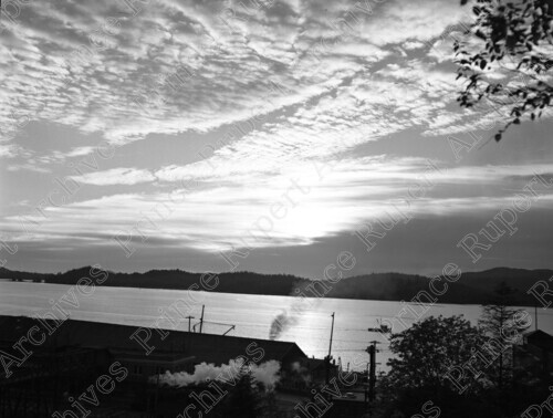 Scope & Content: Item consists of a view from CN Park of a sunset over the Prince Rupert harbour. Handwritten annotation on recto of copy 2 reads: "Pr. Rupert Sunset. From C.N. Park. 1959." Stamped annotation on verso of copy 2 reads: "Photo by Jack Wrathall Prince Rupert, B. C."