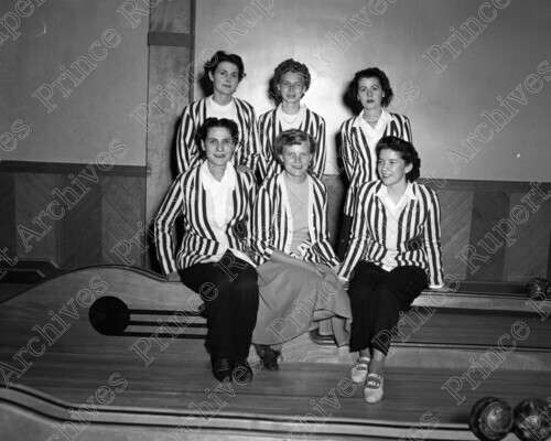 Scope & Content: Item consists of six members of the Rose McCallum bowling team gathered for a photo at a bowling alley. Handwritten annotation on recto of copy 2 reads: "Rose McCallum's Bowling Team. 1948." Stamped annotation on verso of copy 2 reads: "Photo by Jack Wrathall Prince Rupert, B. C."