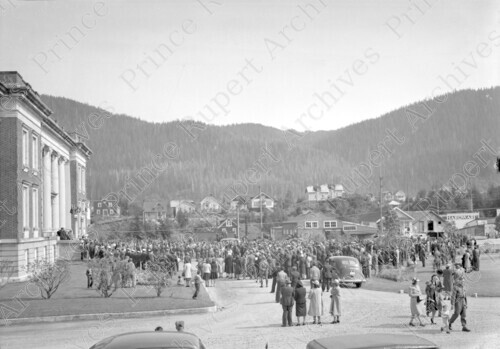 Scope & Content: Item consists of group of people at the Prince Rupert Courthouse on Market Place during King George V's Silver Jubilee celebration. Houses on 4th Avenue East can be seen in the background. Handwritten annotation on recto of copy 2 reads: "Jubilee Celibration [sic]. At Court House. 4th Ave. E. Bk. gr. 1935." Stamped annotation on verso of copy 2 reads: "Photo by Jack Wrathall Prince Rupert, B. C."