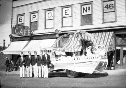 Scope & Content: Item consists of a group of five Elks standing near the Elks parade float in front of the Boston Cafe on the 600 block of 3rd Avenue West during King George V's Silver Jubilee. The elks pictured from left to right are: Charlie Balagno, Mike Budenich, Martin Van Cooten, Bill Stone and Lee Gordon. A group of women can be seen sitting on the parade float. Handwritten annotation on recto of copy 2 reads: "Jubilee Parade. 600 Blk. 3rd. Ave. W. 1935. 1. Charlie Balagno - 2. Mike Budnich [sic]. 3. Martin Van-Cootin [sic]. 4. Bill Stone - 5. Lee Gordon." Stamped annotation on verso of copy 2 reads: "Photo by Jack Wrathall Prince Rupert, B. C."