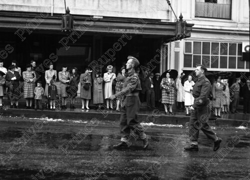 Scope & Content: Item consists of Harold Ponder and another soldier, marching in the V-J parade in front of the Besner Block on the 300 Block of 3rd Avenue West. Handwritten annotation on verso of copy 2 reads: "Harold Ponder. V.J. Day Parade. 300 Blk. 3rd. Ave. W. Prince Rupert, B.C. Aug. 1945." Stamped annotation on verso of copy 2 reads: "Photo by Jack Wrathall Prince Rupert, B. C."
