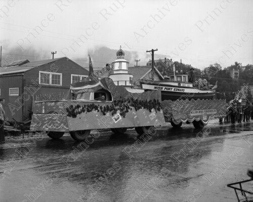 Scope & Content: Item consists of Nelson Bros. Fisheries Ltd. float in the Queen Elizabeth II's Coronation Parade. The float consists a truck decorated with a large crown pulling the boat "Miss Port Edward" on a trailer. Handwritten annotation on recto of copy 2 reads: "Coronation Parade. Prince Rupert, B.C. 1953." Stamped annotation on verso of copy 2 reads: "Photo by Jack Wrathall Prince Rupert, B. C."
