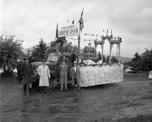 Scope & Content: Item consists of Prince Rupert Chinese Association float in the Coronation Parade on Market Place. Pictured standing beside the float third from the left is Gee Mah and pictured fifth from the left is Danny Mah. Handwritten annotation on recto of copy 2 reads: "Coronation Parade. Prince Rupert. 1. 2. 3. Gee Mah. 4. 5. Danny Mah. 1953."