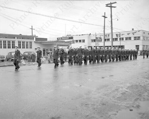 Scope & Content: Item consists of U.S. Navy officers and sailors marching up McBride St. past Bob Parker Ltd. during Queen Elizabeth II's coronation parade. Handwritten annotation on recto of copy 2 reads: "Coronation Parade. U.S. Navy McBride St. 1953." Stamped annotation on verso of copy 2 reads: "Photo by Jack Wrathall Prince Rupert, B.C."