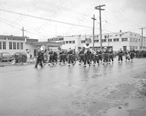 Scope & Content: Item consists of a marching band in Queen Elizabeth II's Coronation Parade on McBride Street near Bob Parker Ltd. Handwritten annotation on recto of copy 2 reads: "Coronation Parade. Navy Band. 1953." Stamped annotation on verso of copy 2 reads: "Photo by Jack Wrathall Prince Rupert, B. C."