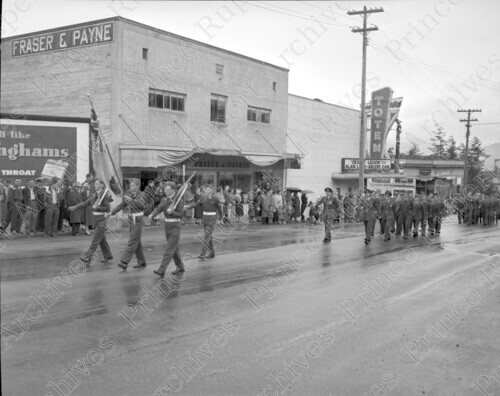 Scope & Content: Item consists of Queen Elizabeth II's coronation parade including Sea Cadets passing Fraser & Payne, Totem Theatre, and the Enterprise Fruit Co. on the 100 to 200 Block of 3rd Avenue West. Handwritten annotation on recto of copy 2 reads: "Coronation Parade. 1953." Stamped annotation on verso of copy 2 reads: "Photo by Jack Wrathall Prince Rupert, B. C."