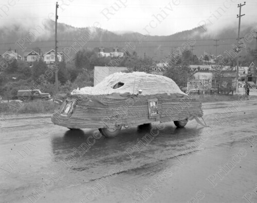 Scope & Content: Item consists of Queen Elizabeth II's coronation parade including Ellis Air Lines and Ye Old Barber Shop floats passing 3rd Avenue West and 2nd Street. The Fraser & Payne clothing core can be seen in the background on the right. Handwritten annotation on recto of copy 2 reads: "Coronation Parade - 3rd. Ave. 2nd. St. 1953." Stamped annotation on verso of copy 2 reads: "Photo by Jack Wrathall Prince Rupert, B. C."