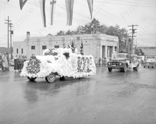 Scope & Content: Item consists of Queen Elizabeth II's coronation parade including an Imperial Order Daughters of the Empire (IODE) float passing 3rd Avenue West and 2nd Street. Handwritten annotation on recto of copy 2 reads: "Coronation Parade. 1953." Stamped annotation on verso of copy 2 reads: "Photo by Jack Wrathall Prince Rupert, B. C."