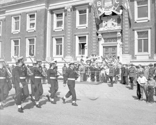 Scope & Content: Raising of the B.C. centennial flag at the courthouse, navy marching past, front of building, RCMP in serge and others watching