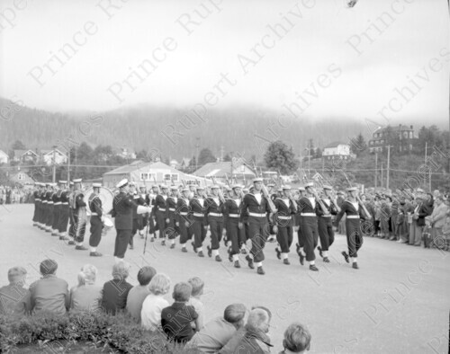 Scope & Content: Item consists members of HMCS Chatham marching in to the Prince Rupert Courthouse grounds on Market Place for the raising of the B.C. Centennial flag, while a crowds watches. St. Andrew's Anglican Cathedral on 4th Avenue West can be seen in the background on the right. Handwritten annotation on recto of copy 2 reads: "Navy - Front of Court House. Riasing Centenial [sic] Flag. Apr. 27 - 1958." Stamped annotation on verso of copies 2 and 3 reads: "Photo by Jack Wrathall Prince Rupert, B. C."