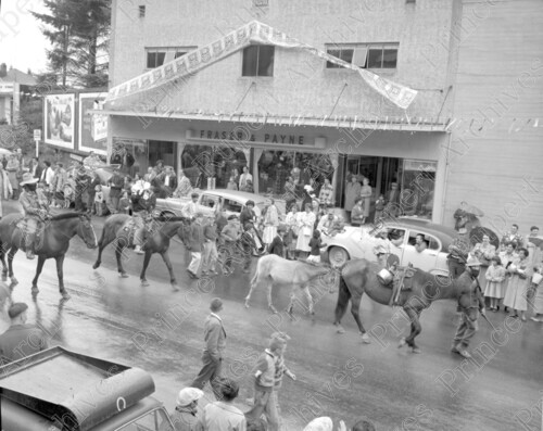 Scope & Content: Item consists of a parade making its way down the 200 block of 3rd Avenue West including people riding on horseback. Handwritten annotation on recto of copy 2 reads: “Parade. 200 Blk. 3rd. Ave. W. Pr. Rupert, B.C. Aug. 2. 1958.” Stamped annotation on verso of copy 2 reads: “Photo by Jack Wrathall Prince Rupert, B. C.”