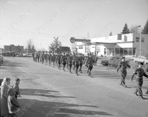 Scope & Content: Item consists of RCMP officers marching in the Armistice Day parade on the 400 block of 2nd Avenue West past McRae Motors. Handwritten annotation on recto of copy 2 reads: "Armistice Day Parade. 400 Blk. 2nd. Ave. Pr. Rupert. R.C.M. Police. 1959." Stamped annotation on verso of copy 2 reads: "Photo by Jack Wrathall Prince Rupert, B. C."