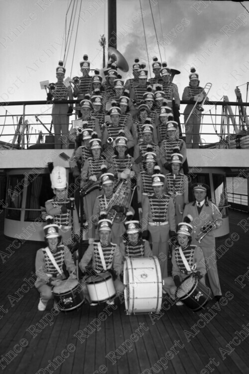 Scope & Content: Item consists of an American girls and boys band aboard a ship, in uniform with instruments at an unknown location. The band was headed for Prince Rupert, B.C. Handwritten annotation on recto of copy 2 reads: "American Band. Visiting Pr. Rupert. Dec. 28 - 1949." Stamped annotation on verso of copy 2 reads: "Photo by Jack Wrathall Prince Rupert, B. C."