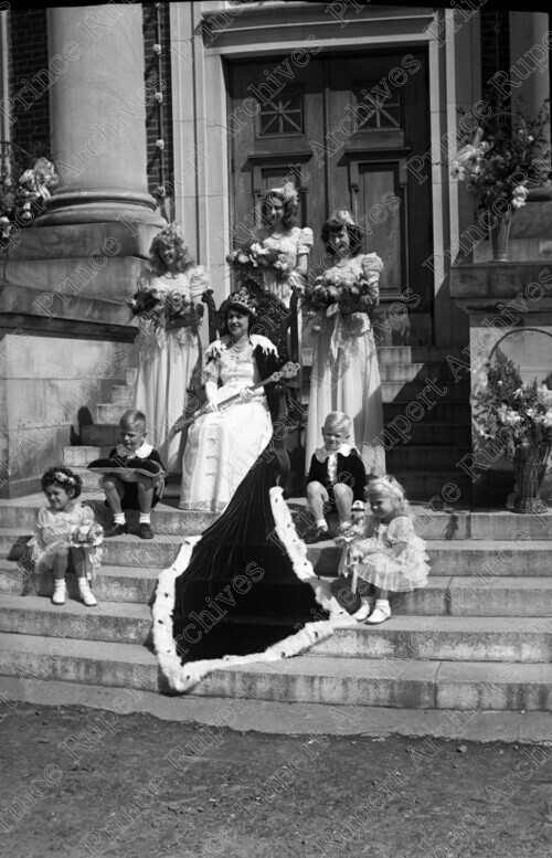 Scope & Content: Item consists of Carnival Queen Lorraine Youngman sitting on a throne on the front steps of the Prince Rupert Courthouse steps on Market Place with Ruth Jerstad, Betty Pullen, Greg McLeod and three other children. Youngman can also be seen wearing a crown and holding a sceptre. Handwritten annotation on recto of copy 2 reads: "1. Ruth Jerstad. 2. Betty Pullen. 3. Lorraine Youngman. Carnival Queen. 1947." Stamped annotation on verso of copy 2 reads: "Photo by Jack Wrathall Prince Rupert, B. C."