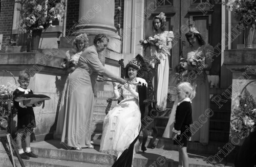 Scope & Content: Item consists of Prince Rupert Mayor Nora Arnold handing Carnival Queen Lorraine Youngman a royal sceptre while Ruth Jerstad, Betty Pullen, Greg McLeod and an unidentified child look on at the Prince Rupert Courthouse on Market Place. Handwritten annotation on recto of copy 2 reads: "1. Ruth Jerstad. 2. Mayor Nora Arnold. 3. Betty Pullen. 4. Lorraine Youngman. Carnival Queen. 1947. Greg McLeod." Stamped annotation on verso of copy 2 reads: "Photo by Jack Wrathall Prince Rupert, B. C."