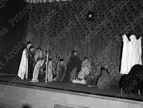 Scope & Content: Item consists of children in costume during a Christmas concert at the Prince Rupert Civic Centre on 2nd Avenue West and McBride Street. Handwritten annotation on recto of copy 2 reads: "Christmas Concert. Civic Centre. 100 Blk. 2nd. Ave. W. 1947." Stamped annotation on verso of copy 2 reads: "Photo by Jack Wrathall Prince Rupert, B. C."