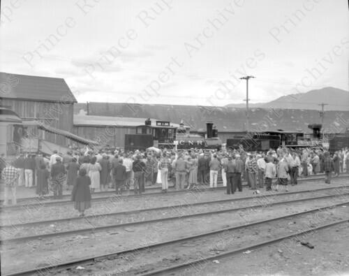 Scope & Content: Item consists of crowds watching CNR Museum of Northern train 247, CN engine 40, and Grand Trunk 713 pulling in at the waterfront. Handwritten annotation on recto of copy 3 reads: "Museum Train. C.N.R. Engine 247 - G.T.P. Engine 40. Pr. Rupert. June 16 - 1958." Stamped annotation on verso of copy 3 reads: "Photo by Jack Wrathall Prince Rupert, B. C."