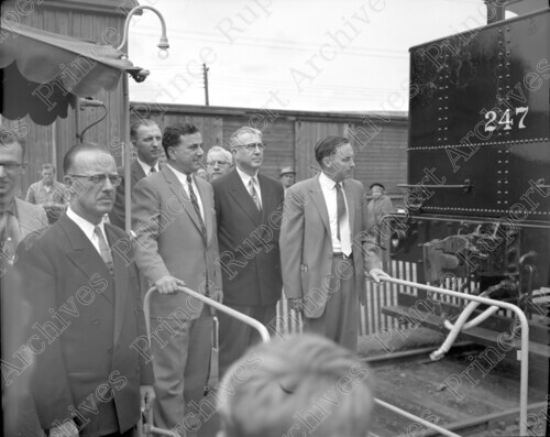 Scope & Content: Item consists of MLA Bill Murray, Mayor Peter Lester, Dr. R. G. Large and Pat McIlroy standing next to a CNR train engine belonging to the Museum of Northern B.C. Handwritten annotation on recto of copy 2 reads: "Museum Train. Bill Murray Murray [sic]. MLA Mayor Pete Lester. Dr. R. G. Large. Pat McIlroy. C.N.R. 1958." Stamped annotation on verso of copy 2 reads: "Photo by Jack Wrathall Prince Rupert, B. C."