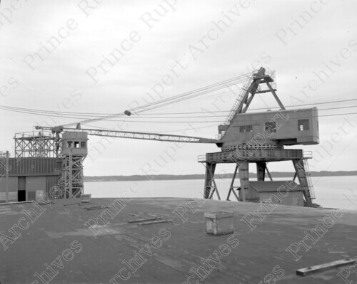 Scope & Content: Item consists of view of a large crane at the Prince Rupert Drydock and Shipyard. Handwritten annotation on recto of copy 2 reads: "Prince Rupert Drydock. Big Crane. Apr - 11 - 1951." Stamped annotation on verso of copy 2 reads: "Photo by Jack Wrathall Prince Rupert, B. C."