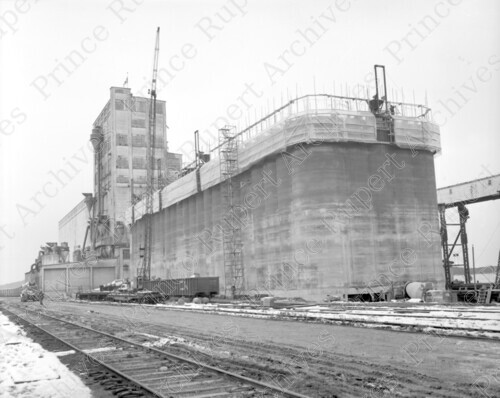 Scope & Content: Item consists of a view from the ground of new east wing being built for the Canadian Government Grain Elevator on the waterfront. Handwritten annotation on recto of copy 2 reads: "Building New Wing to Pr. Rupert Grain Elevator - 1967." Stamped annotation on verso of copy 2 reads: "Photo by Jack Wrathall Prince Rupert, B. C."