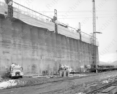 Scope & Content: Item consists of a view from the ground of new east wing being built for the Canadian Government Grain Elevator on the waterfront. The new wing was built by C.D. Howe Co. Ltd. Handwritten annotation on recto of copy 2 reads: "Building New East Wing to Pr. Rupert Elevator. 1967." Stamped annotation on verso of copy 2 reads: "Photo by Jack Wrathall Prince Rupert, B. C."