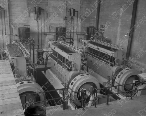 Scope & Content: Item consists of the interior of the power house at the Prince Rupert Drydock Shipyard The power house was eventually taken over by B.C. Hydro. Handwritten annotation on recto of copy 2 reads: "Prince Rupert Drydock. Power House. Taken Over by B.C. Hydro. 1951." Stamped annotation on verso of copy 2 reads: "Photo by Jack Wrathall Prince Rupert, B. C."