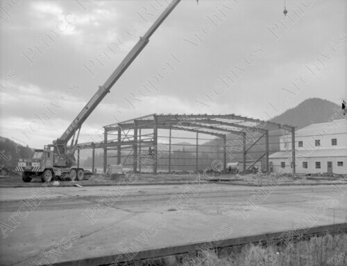 Scope & Content: Item consists of a view of a Much Crane Service crane and workers during construction of the RCMP hangar by West Construction Co. at Seal Cove. Handwritten annotation on recto of copy 2 reads: "Bldg - R.C.M. Police hanger. Seal Cove. 1968." Stamped annotation on verso of copy 2 reads: "Photo by Jack Wrathall Prince Rupert, B. C."