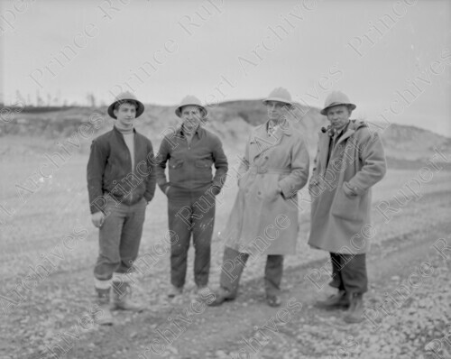 Scope & Content: Item consists of the four men in charge of building Prince Rupert Airport on Digby Island standing together at the Airport's construction site. Handwritten annotation on recto of copy 2 reads: "Men in Charge - Building Pr. Rupert Airport. Digby Isl. 1959." Stamped annotation on verso of copy 2 reads: "Photo by Jack Wrathall Prince Rupert, B. C."