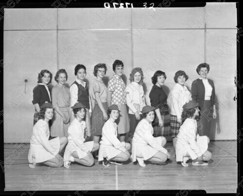 Scope & Content: Item consists of a group of 13 female students and a teacher in the gym at Booth Memorial (Junior) High School. Pictured in the back row, from left to right is Janet McDonald, Heather Baxter, Charlotte Galbraith, Yvonne Howdan, Doris Albert, June Insulander, Judy Stubbs, Shirley Robb, and Miss McNight. Pictured in the front row wearing cheerleader uniforms from left to right are: Deloris Garbelia, Sharlene Closter, Shirley Thomas, Georgina Dibb, and Judy Grimolfson. Handwritten annotation on recto of copy 2 reads: "Pr. Rupert Jr. High School. 19." Stamped annotation on verso reads: "Photo by Jack Wrathall Prince Rupert, B. C."