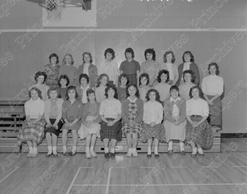 Scope & Content: Item consists of twenty-five female students in the gym at Booth Memorial (Junior) High School. Pictured in the front row third from the left is Gail Johnson. Pictured in the back row third from the left is Maureen Hampton and seventh from the left is Wendy Armstrong. Handwritten annotation on recto of copy 2 reads: "Pr. Rupert Jr. High School. 19." Stamped annotation on verso of copy 2 reads: "Photo by Jack Wrathall Prince Rupert, B. C."