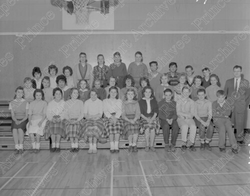 Scope & Content: Item consists of thirty-five students and a teacher in the gym at Booth Memorial (Junior) High School. Pictured in the front row first on the left is a girl named Judy, second from left is Helen Brickson, fifth from the left is Sylvia Carlson, eighth from the left is Janet Carlson and tenth from the left is Bruce Mareno. Pictured in the middle row first on the left is Maria Kiner and pictured ninth on the left is Jean Alexander. Pictured in the back row third from the left is a girl named Valerie, pictured fourth from the left is John Bremner, fifth from the left is Ken Bowman and eight from the left is Terry Lum. Handwritten annotation on recto of copy 2 reads: "Pr. Rupert Jr. High School. 19." Stamped annotation on verso of copy 2 reads: "Photo by Jack Wrathall Prince Rupert, B. C."