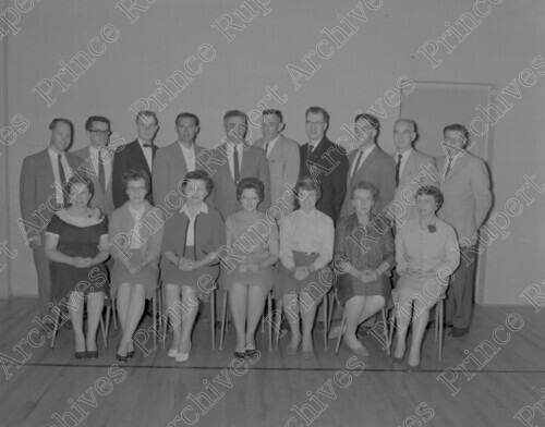 Scope & Content: Item consists of seventeen teachers in a group in the gym at the Prince Rupert Senior Secondary School. Pictured in the back row from left to right is: Mr. Wilson, Jim Batemen, Mr. Epp, Mr. Dowschuck, Len Truscott, Mr. Ewen, Bruce Bennet, Tommy Boulter, Frank Sutton and Don Hartwig. Pictured in the front row from left to right is: Yolande Lepine, Daphne Scott, Helen Krueger, Ms. Lloyd, Ms. Jackson, Ruth Sharp and Mrs. St. Clair. Handwritten annotation on verso reads: "Senior Sec. High School Teachers, May 28-1962." Stamped annotation on verso reads: "Photo by Jack Wrathall Prince Rupert, B. C."