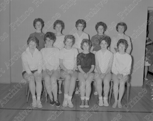 Scope & Content: Item consists of ten female students from the Prince Rupert Senior Secondary School women's volleyball team and their teacher in the School's gymnasium. Pictured in the front row is: Joylea Rossi, Donna Anweiler, Marilyn Peagam, Trudy Rochon, Heather Moore and Sharon Johnstone. Pictured in the back row is: Leona Wick, Helga Holmes. Eva Rydde, Lynn MacIntyre and teacher Ms. Johnson. Handwritten annotation on recto of copy 2 reads: "Senior Sec. School. May 28-1962." Stamped annotation on verso of copy 2 reads: "Photo by Jack Wrathall Prince Rupert, B. C."