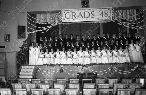 Scope & Content: Item consists of a graduating class from Booth Memorial School of fifty-seven students gathered on a stage. Handwritten annotation on recto of copy 3 reads: "Graduation Class - 1948 - Prince Rupert. 1948." Handwritten annotation on recto of copy 4 reads: "Booth School." Stamped annotation on verso of copies 3 and 4 reads: "Photo by Jack Wrathall Prince Rupert, B. C."