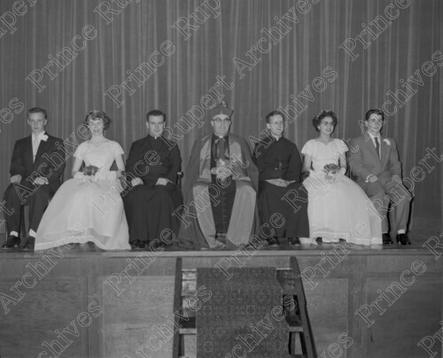 Scope & Content: Item consists of four Annunciation Catholic school graduates on a stage with two priests and a bishop